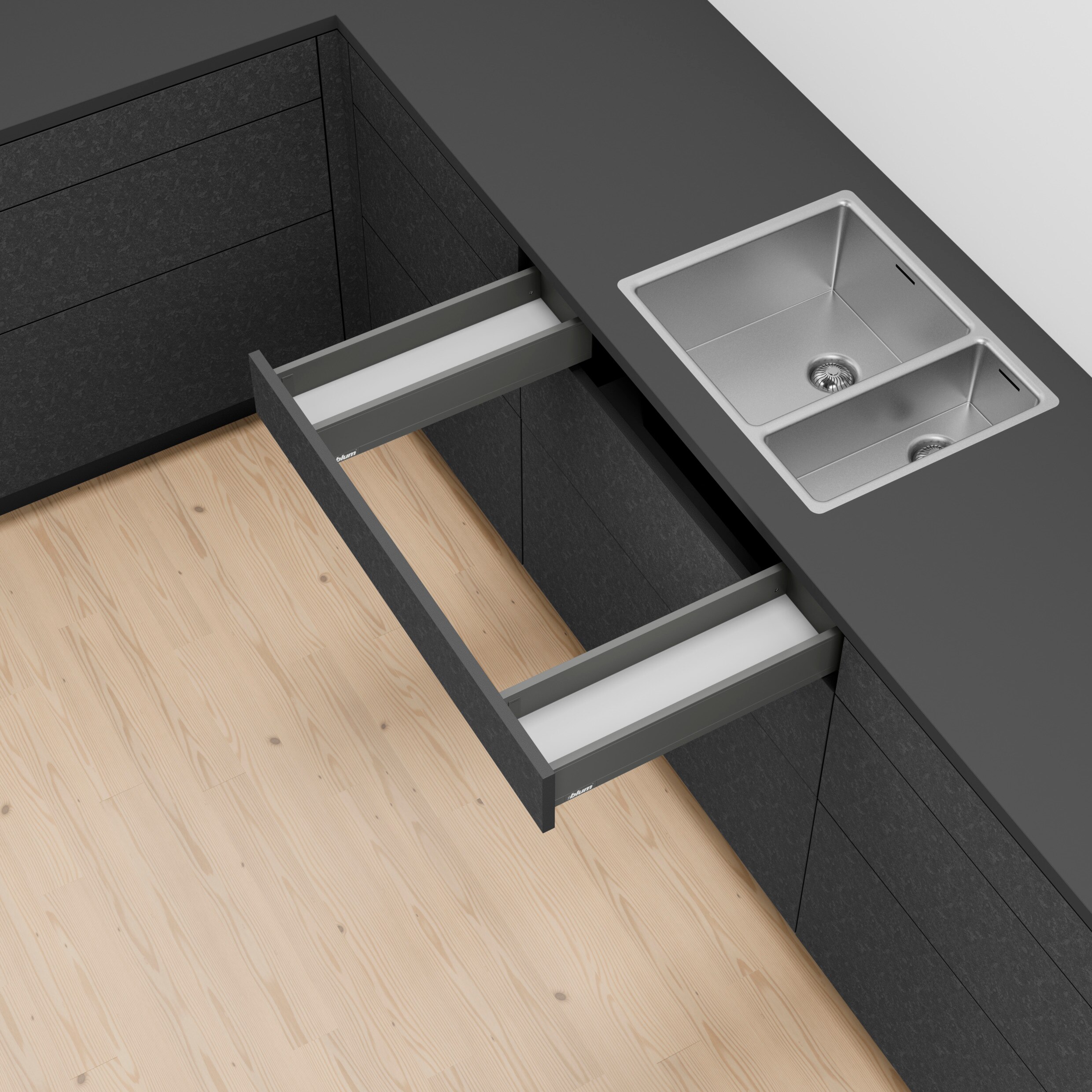With the front fixing set, the front of the inner pull-out can be securely attached to the drawer sides. It is used in the LEGRABOX box system.